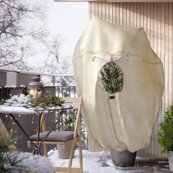 De beschermhoes vormt een doeltreffende barrière tegen ijzige wind, vorst en sneeuw, maar laat tegelijkertijd wel lucht, licht en vocht door. Zo is de plant beschermt onder optimale omstandigheden en voorkom je scheuren in de bast, bevriezing en uitdroging.